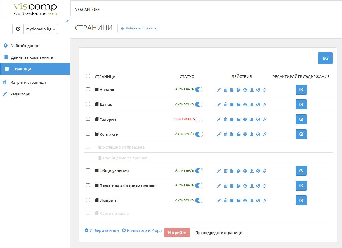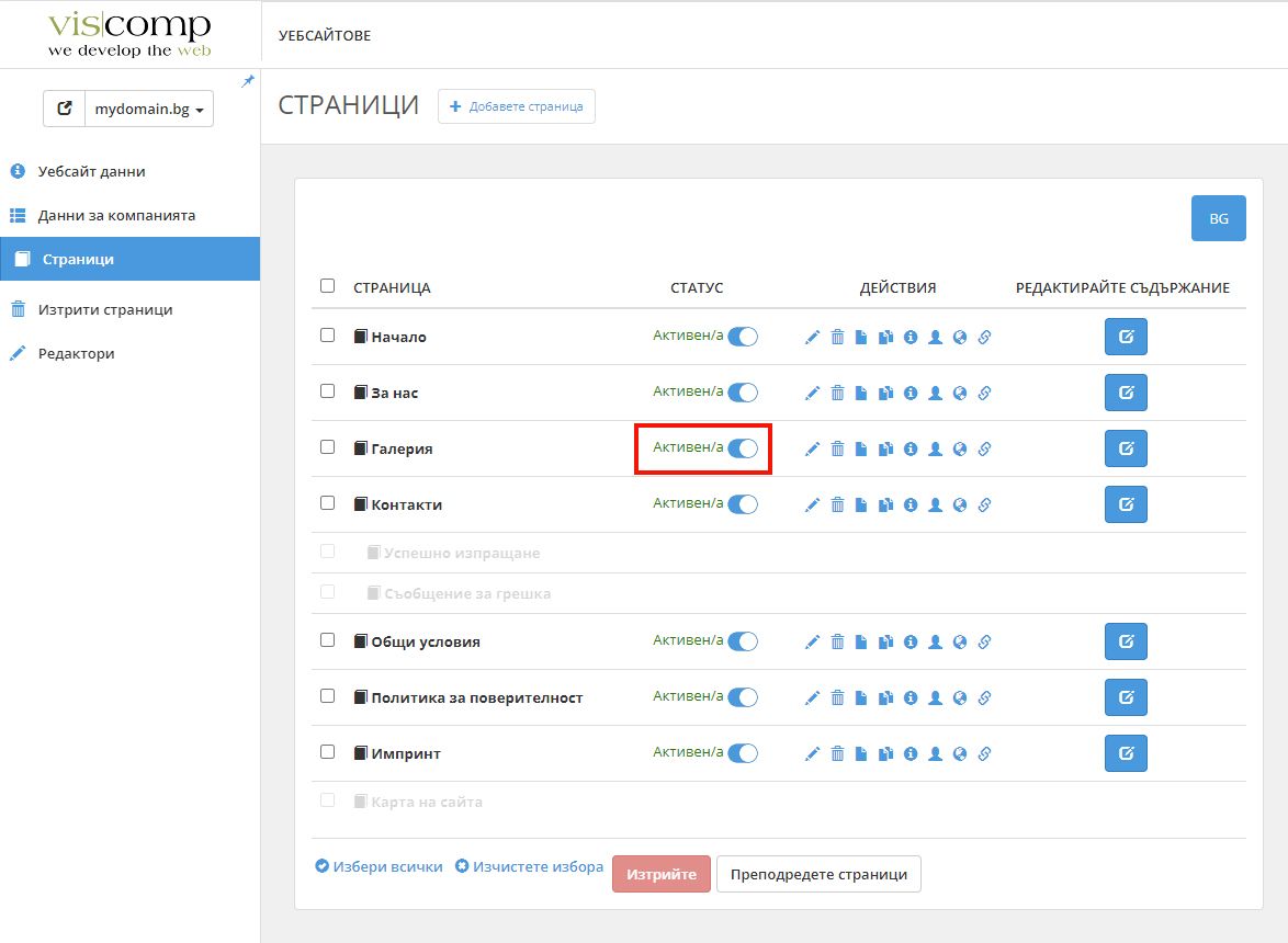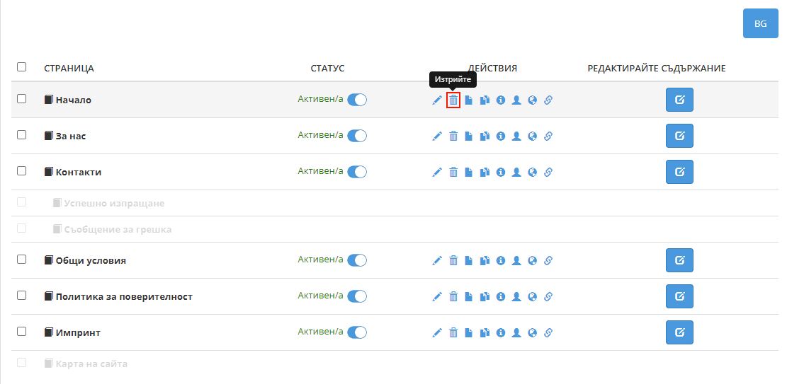 Можем да активираме или деактивираме дадена страница чрез бутона в колоната Статус. Ако изберем дадена страница да бъде активна, то тя ще бъде видима в нашия уебсайт. А ако е неактивна - тя няма да се вижда в уебсайта.