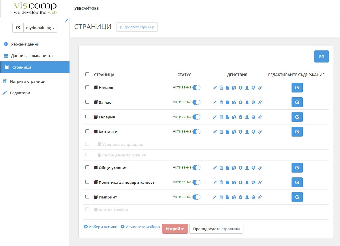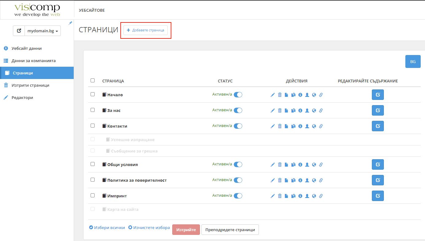 В раздела Страници се намира списък с всички страници на нашия уебсайт. Оттук можем да променяме настройките на страниците, както и да редактираме тяхното съдържание.