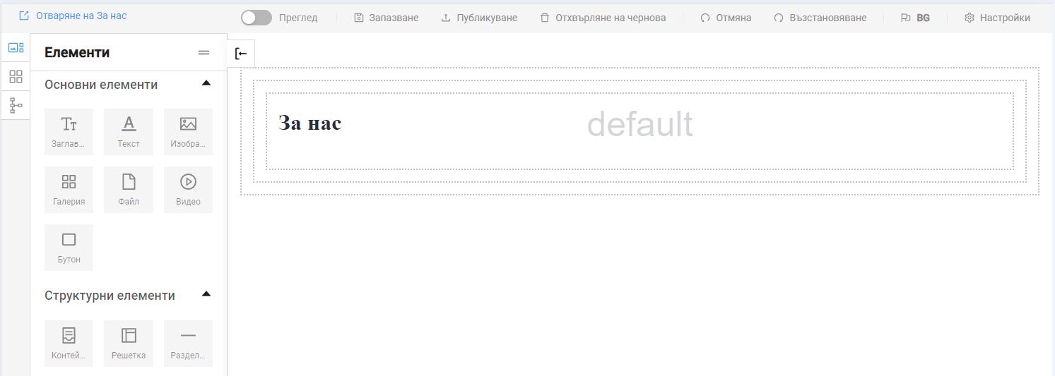 Съдържанието на дадена страница можем да редактираме от бутона в колоната Редактирайте съдържание. Например, ако искаме да редактираме съдържанието на страницата "За нас", трябва да натиснем бутона, както е показано на снимката: