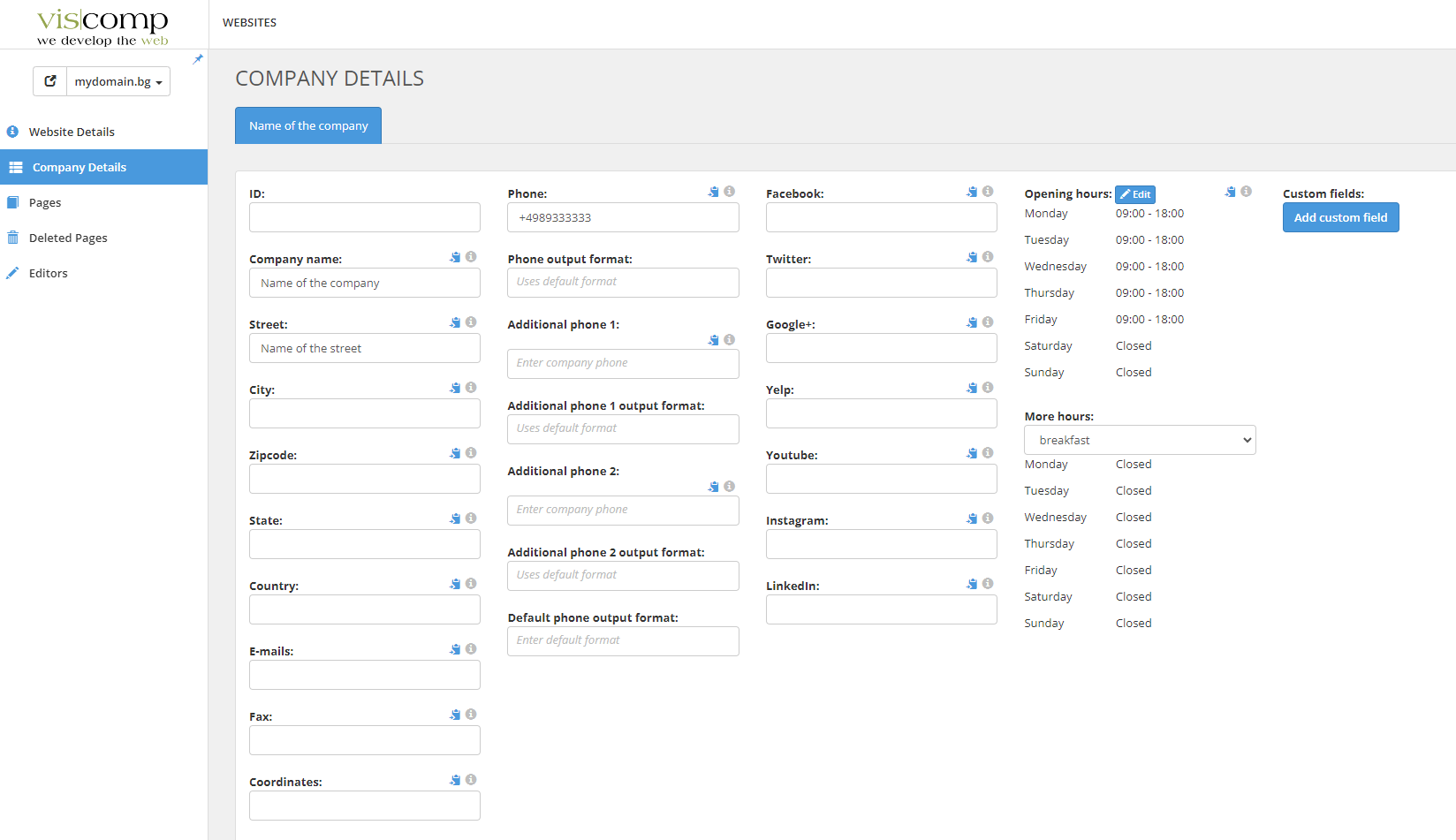 This section contains the company details that will be displayed on the website. From here, we can add and/or edit the company name, address, phone number, business hours, and more.