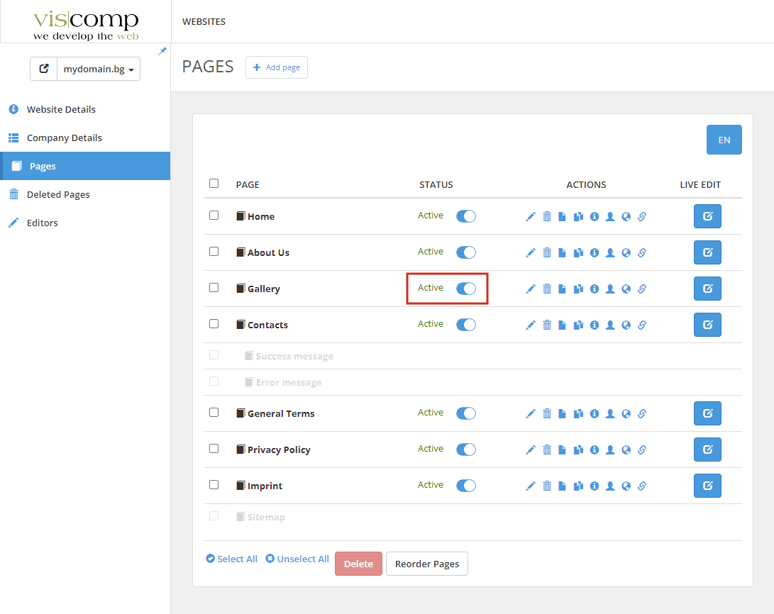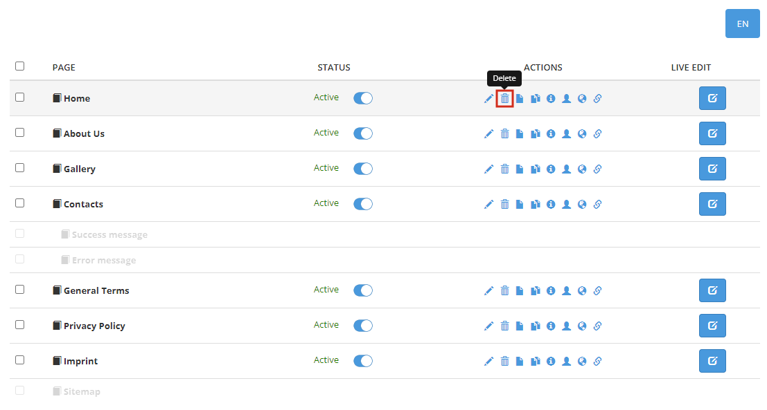 We can enable or disable a given page using the button in the Status column. If we choose to make a page active, it will be visible on our website. If it is inactive, it will not be visible on the website.