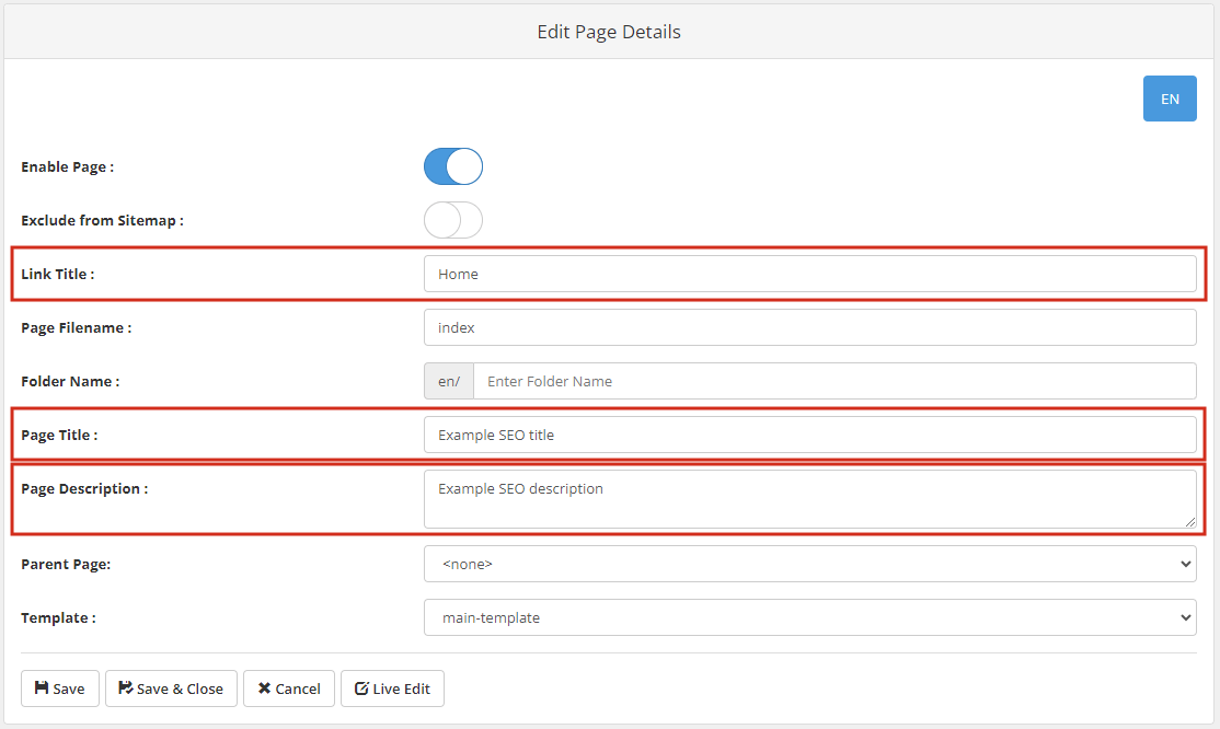 Using the page details edit option, we can change the page name and add SEO title and description.