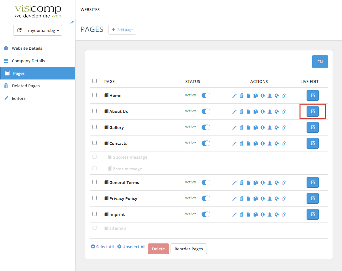 We can edit the content of a specific page by clicking the button in the Live Edit column. For example, to edit the content of the "About Us" page, we would click the button as shown in the picture: