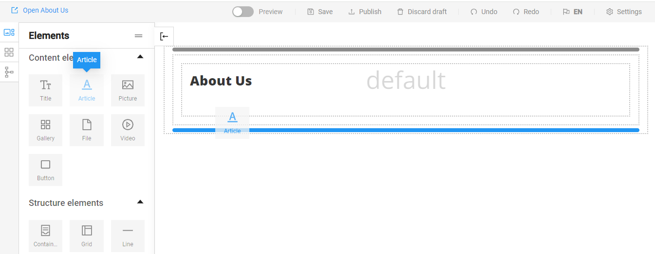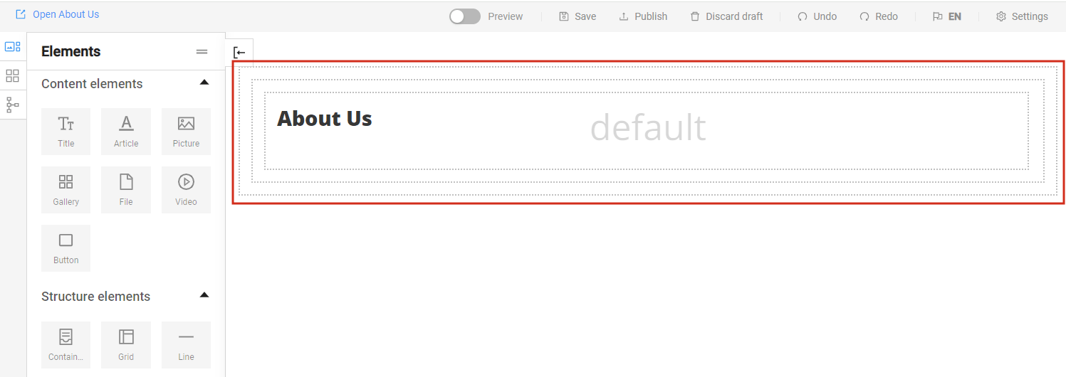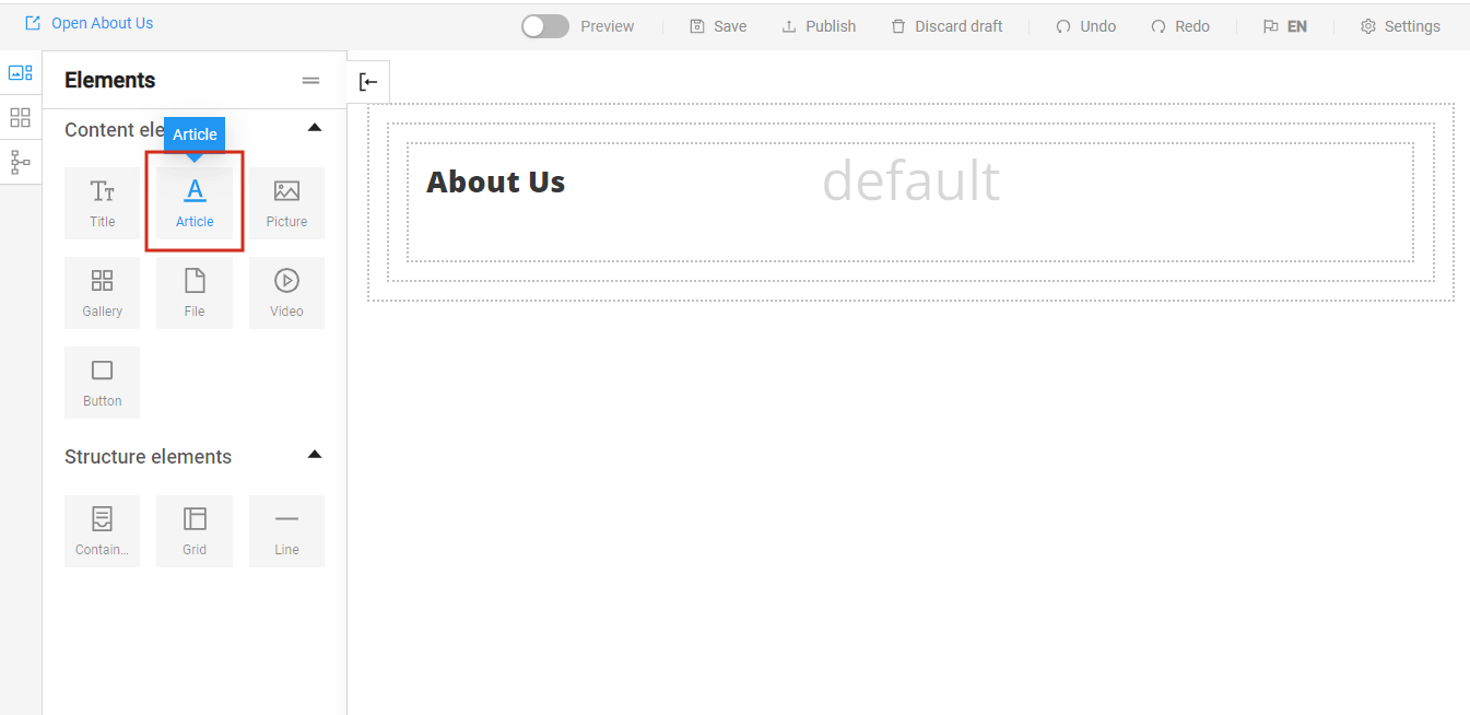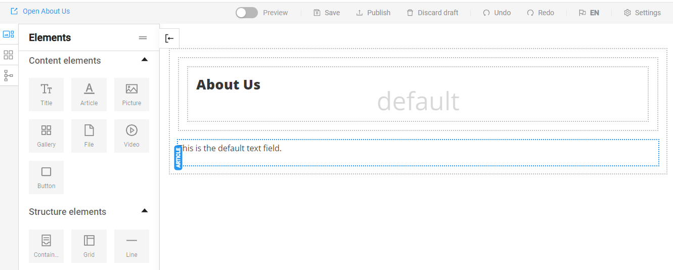 The Elements are divided into Content elements and Structure elements. Content elements include Title, Article, Picture, Gallery, File, Video, and Button. Structure elements include Container, Grid, and Line and help us organize and arrange the content on the page.
