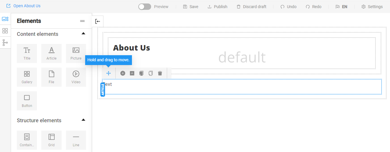 We can change the position of an element on the website by selecting the move button and dragging it to the desired location: