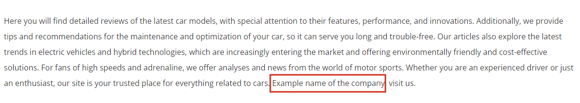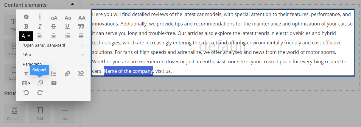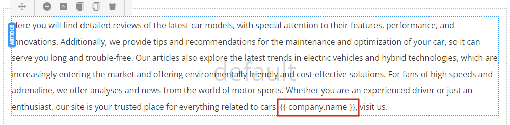 In the page content editing panel, this data is visualized as text between curly braces. In the example: {{ company.name }}, but when the page is published, the actual site will display the filled-in company name information from "Company Details".