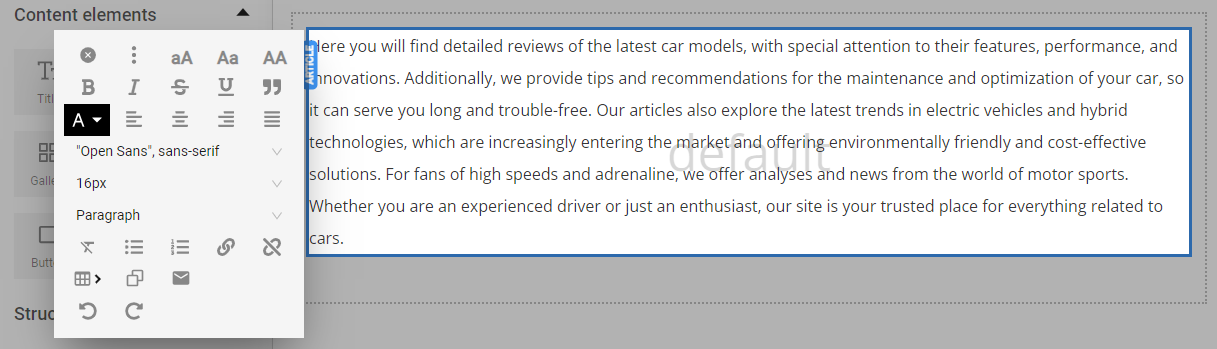 Once added to the page, the "Article" element looks like this, coming with a default sentence: "This is the default text field."