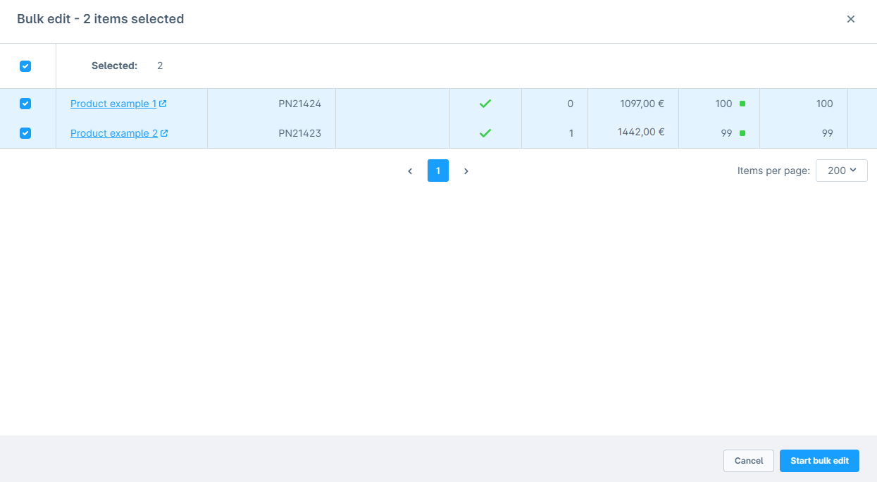 In this view, you can remove products from the current list of selected items. To proceed with editing, click Start bulk edit.