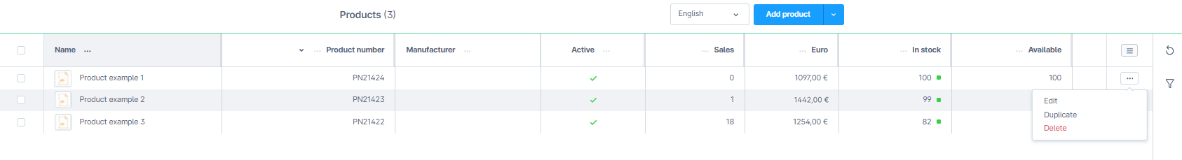 On the right side of each product row, you can use the "..." button to open the context menu for the respective product and access additional functions.