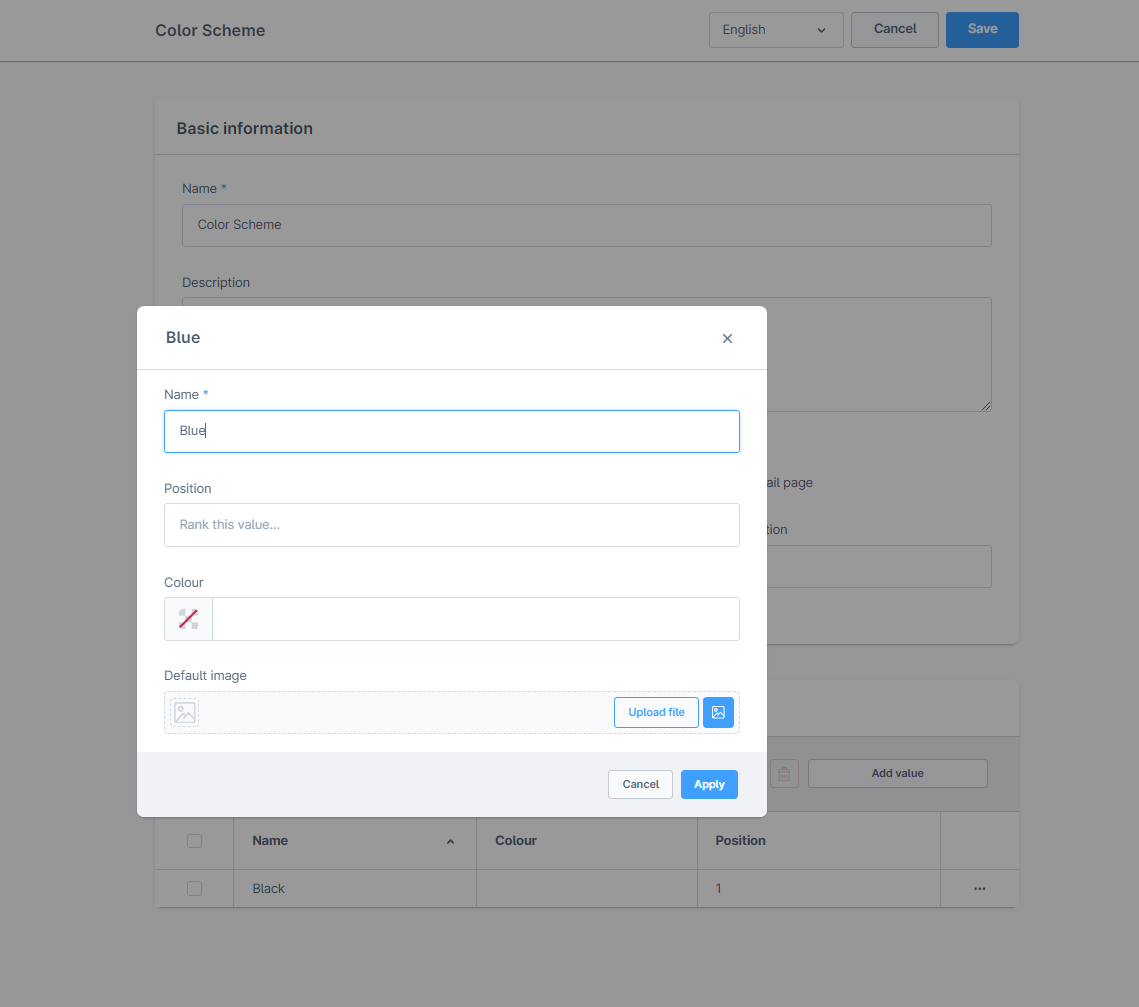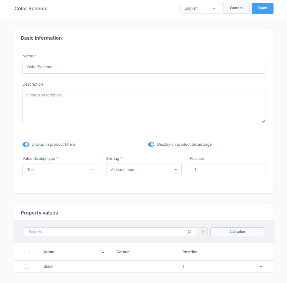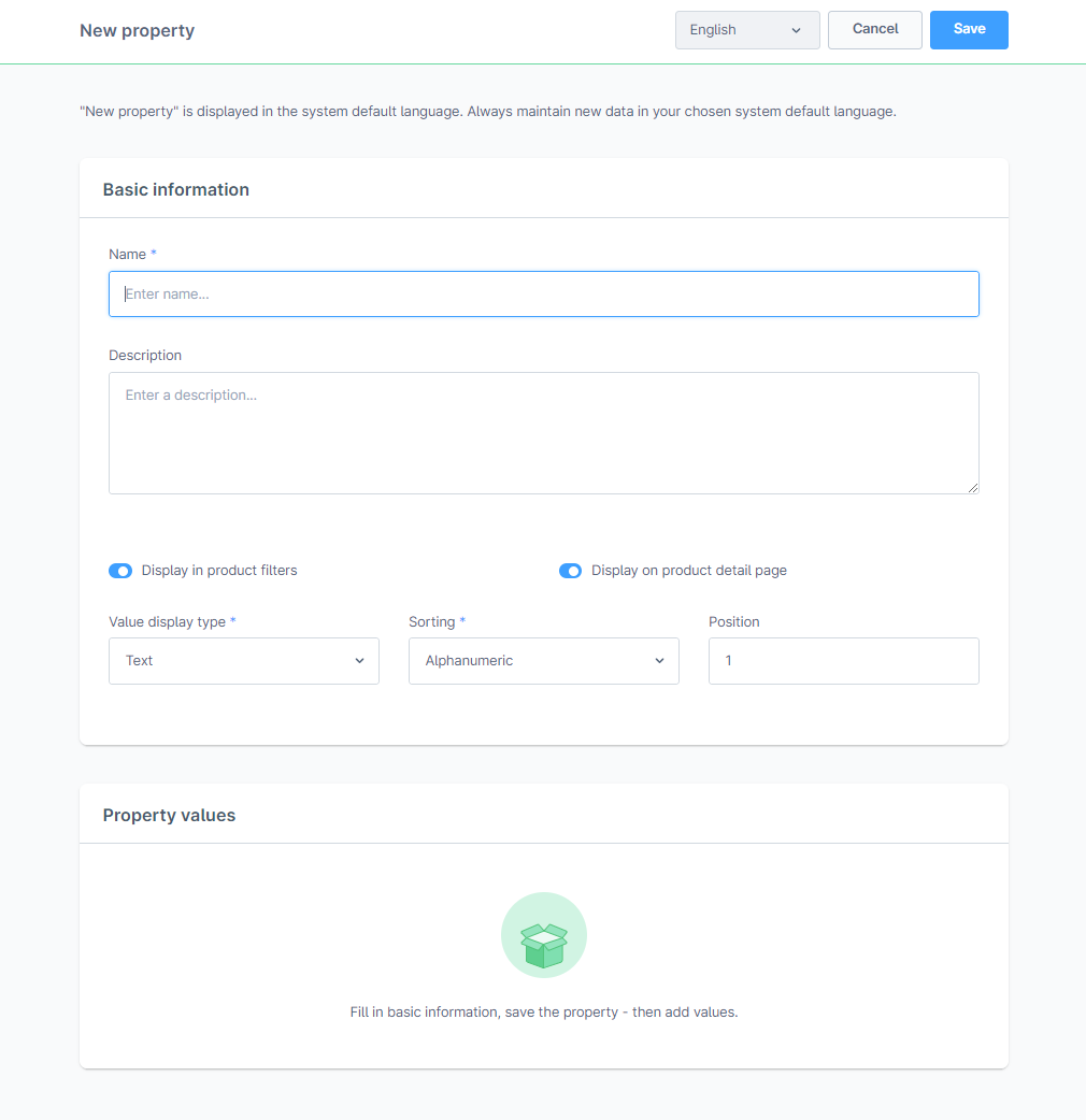 In the main information section, first enter the name of the property. The name will later be displayed, for example, for products on the product detail page. Optionally, you can also enter a brief description. After entering the basic information, click the "Save" button, and then the "Add Value" button will appear. You can use it to add options for the created property.