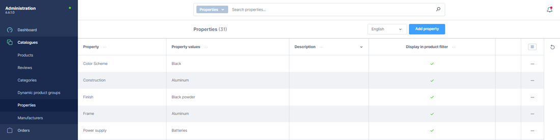 Properties are accessible from: Catalogs > Properties, where you can find a list of all available properties with their corresponding values.