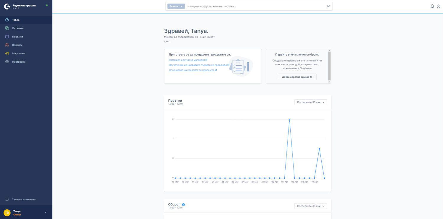 Ако потребителското име и паролата са коректно попълнени, ще се визуализира страницата Табло от администрацията на електронния магазин, която съдържа статистики на направените поръчки.