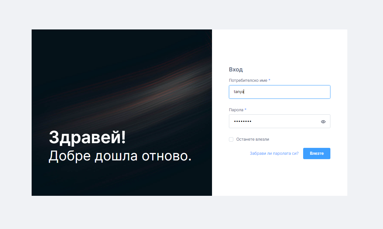 Във формата се попълнват предоставените от нас потребителско име и парола, а след това натиска бутонът Влезте.