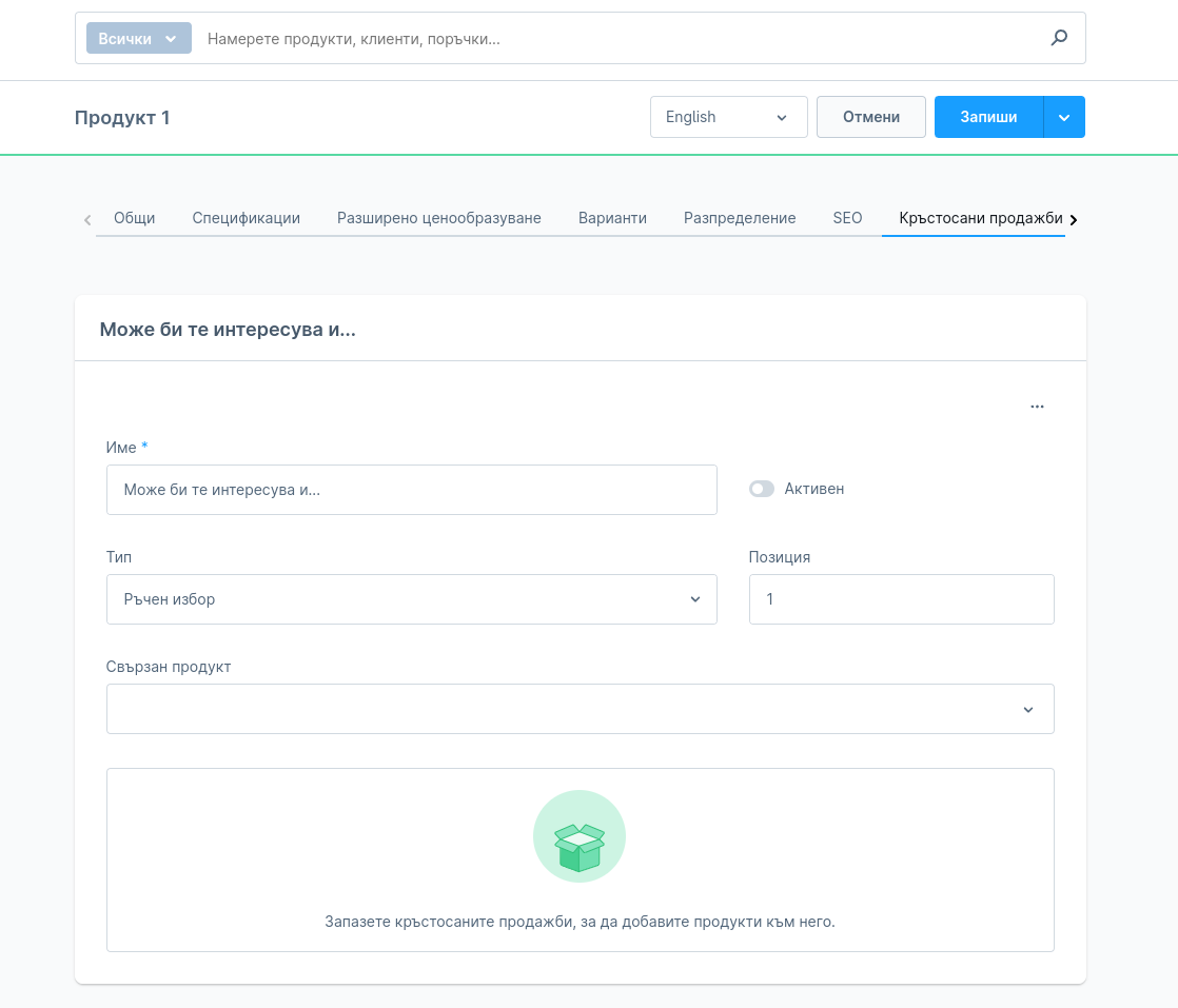 От менюто "Кръстосани продажби", могат да бъдат добавени свързани продукти, за конкретен продукт. Тези продукти се визуализират в списък/слайдшоу във вътрешните страници на продуктите, веднага след основната информацията за продукта.