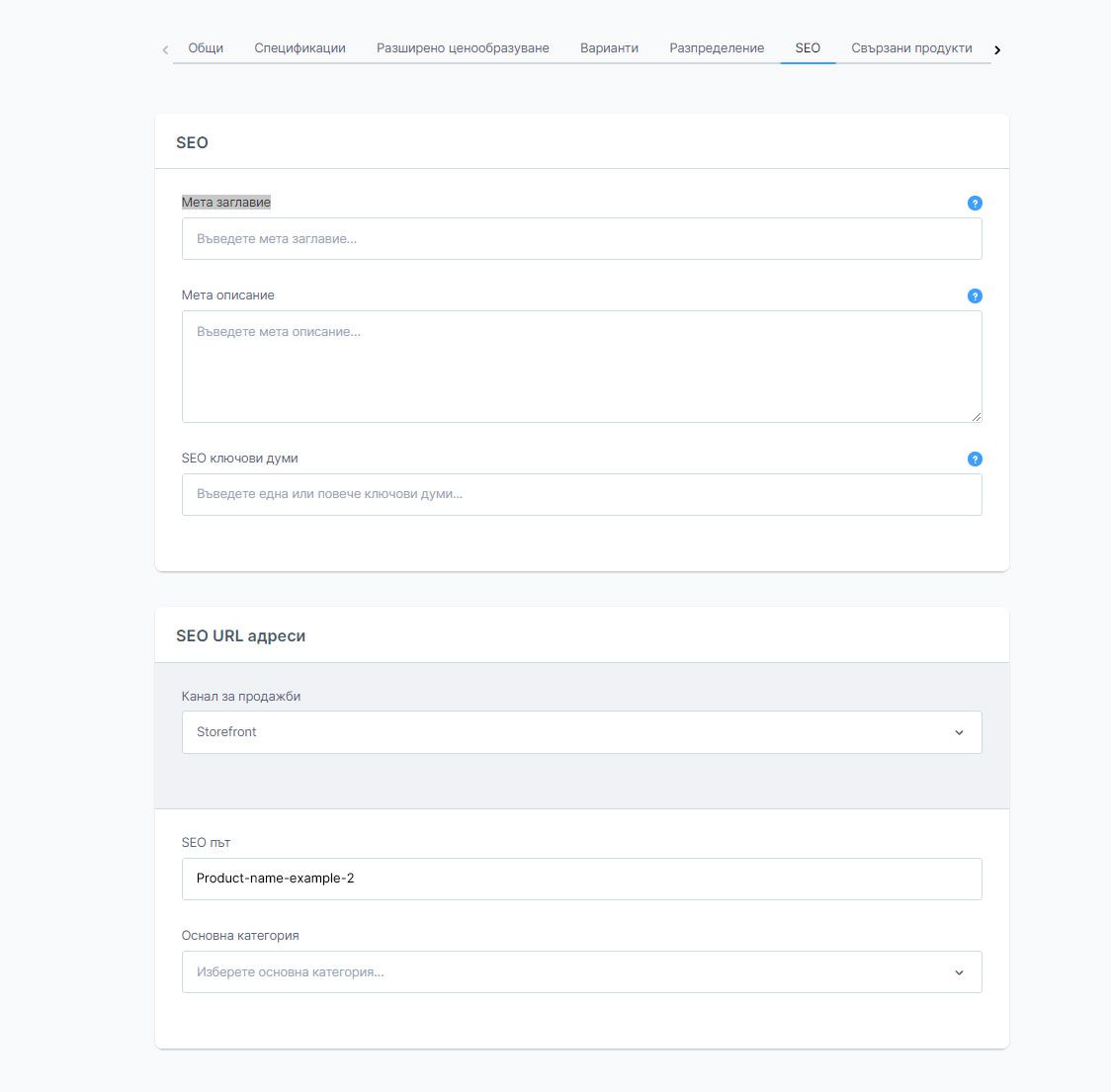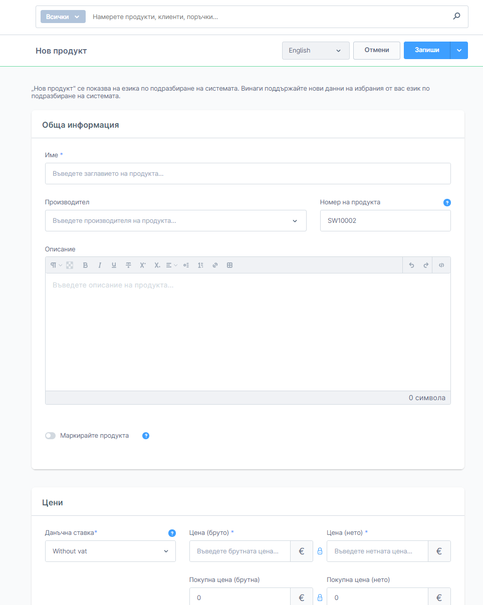 Име - попълва се името на продукта. Това име ще бъде показвано сред другите в списъка с продукти и ще се използва като заглавие на страницата с детайли за продукта.