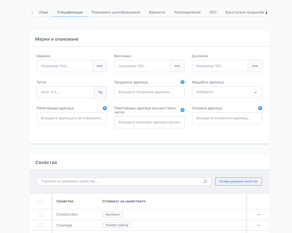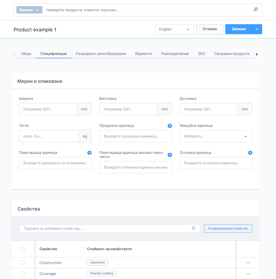 Ширина/Височина/Дължина и Тегло - тук можете да се въведат размерите и теглото на продукта. Информацията може да се показва на страницата с детайли за продукта и може да се използва за изчисляване на цените на доставката.
