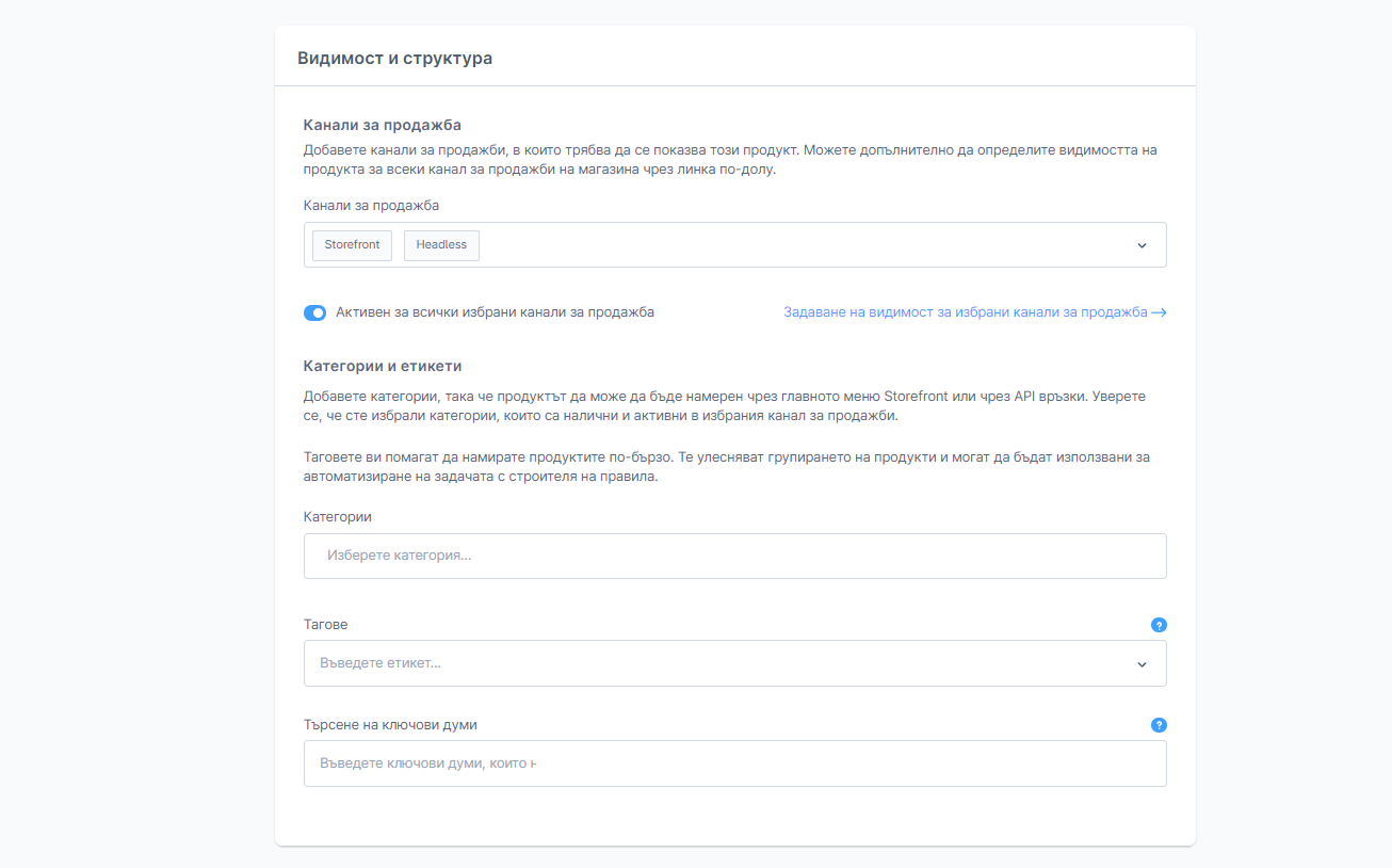 Категории - тук може да се присвоят на продукта една или повече от категориите. В магазина продуктът може да бъде намерен в съответните категории, например чрез използването на навигация или списък с категории.