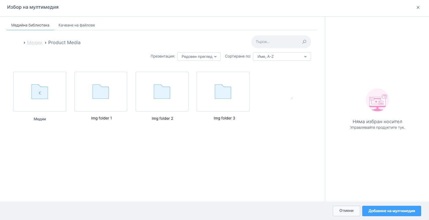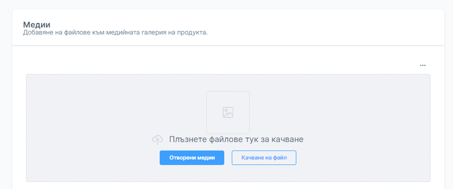 В раздела "Медия" можете да се присвоят желаните медии на продукта, например снимки на продукта. Също така може да се определи, коя снимка да се използва като основна, например за списъка с продукти. Можете също така да се добавят нови файлове от вашия компютър или от интернет (чрез менюто "..." ).