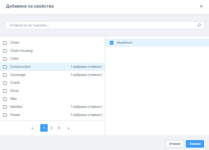 В това меню всички налични свойства се показват в лявата част. Като се щракне върху едно от свойствата, съответните опции се показват в дясната част, които може да се присвоят на продукта, когато се щракне върху съответната отметка на опциите.